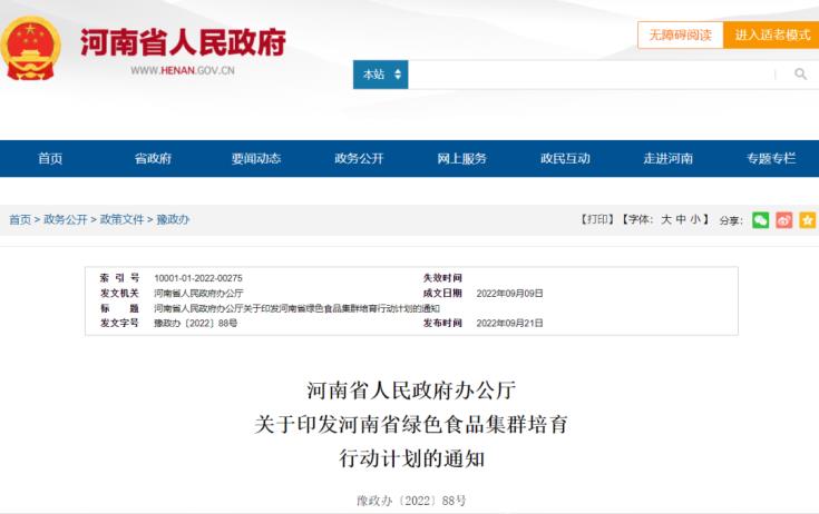 9月21日,河南省人民政府办公厅印发《河南省绿色食品集群培育行动计划》(以下简称"《行动计划》”),明确提出,到2025年,建成具有世界影响力的万亿级现代食品集群,建设绿色食品业强省,省级以上农业产业化重点龙头企业达到1000家以上,培育千亿级企业2家、百亿级企业10家,新增上市企业5家以上。