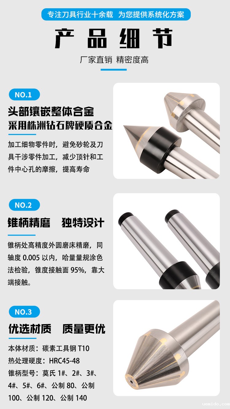 2、正确安装:安装顶尖时,要确保其安装牢固,夹紧装置可靠。对于莫氏锥度安装的顶尖,要使用专用的锥度套筒或敲击工具,避免直接敲打顶尖体,以免损坏锥度配合面。
