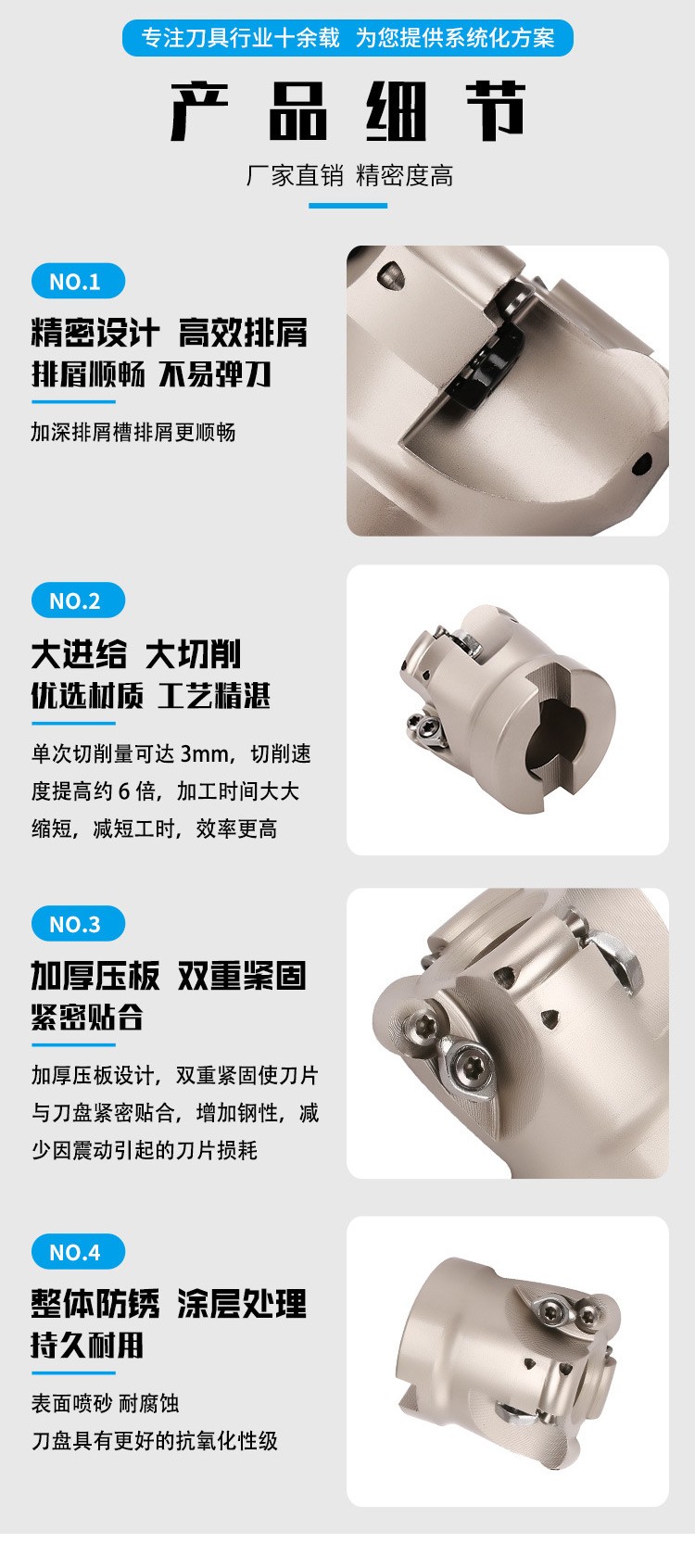特点:整体预硬化,然后再精细加工,提高加工精度检查刀片和铣刀本体之间的间隙用塞尺小于0.02,刀片用完在轴向和径向方向≤0.03时,降低表面粗糙度和延长工具的寿命。