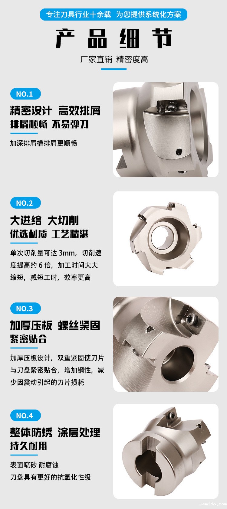 特点:整体预硬化,然后再精细加工,提高加工精度检查刀片和铣刀本体之间的间隙用塞尺小于0.02,刀片用完在轴向和径向方向≤0.03时,降低表面粗糙度和延长工具的寿命。深冷处理:所有CNC铣刀和面铣刀超长冷处理(-180°C以 上超过20小时)提高工具的硬度、韧性、耐久性,并减少残余内应力。